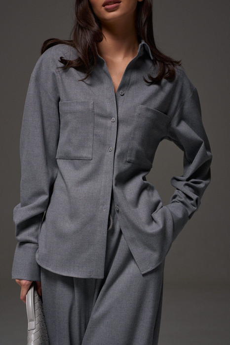 Рубашка прямого кроя, выполнена из текстильного полотна серого цвета. Воротник отложной. Рукав немного спущенный, втачной, с манжетой. Функциональные накладные карманы по переду изделия. Спинка с отрезной кокеткой и встречными складками. Застежка по переду на пуговицах. Длина рукава от линии втачивая 61 см. Длина спинки 66 см