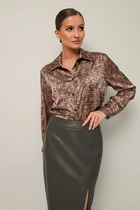 Рубашка прямого свободного кроя. Характеристики: отложной воротник, застежка центральная - петли пуговицы, рукав спущен: по окату рукава вставлен декоративный эленент "крыло", по низу рукава манжета на пуговицах, по переду изделия крупные карманы с лацканом, спинка отрезная с декоративной сборкой, низ в изделии с плавным срезом. Длина по спинке 76 см, длина рукава 54 см.