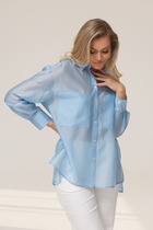 Блузон прямого свободного кроя. Выполнен из мягкого денима цвета хаки. Характеристики: прямой свободный крой, рукав спущеный, по линии талии шлевки, пояс в комплекте. Застёжка центральная на пуговицы, по переду изделия один накладной карман. Над манжетом защипы, манжет застёгивается на три пуговицы. Длина по спинке 75 см, длина рукава от края горловины 73 см.