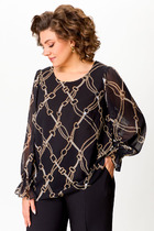 Блуза свободного кроя с отложным воротником на планке с застёжкой на петли – пуговицы контрастного цвета. Рукав со спущенной проймой на манжете. Спинка на кокетке со встречной складкой. Низ спинки имеет фигурную форму.