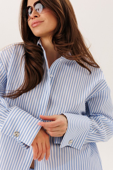 Блузка женская "оверсайз" прямого силуэта. Воротник отложной на стойке. Рукав спущенный с притачной широкой манжетой с отворотом. Манжет с акцентной пуговицей. Разрез рукава обработан планкой. Застежка по переду потайная, на пробивные петли и пришивные пуговицы
