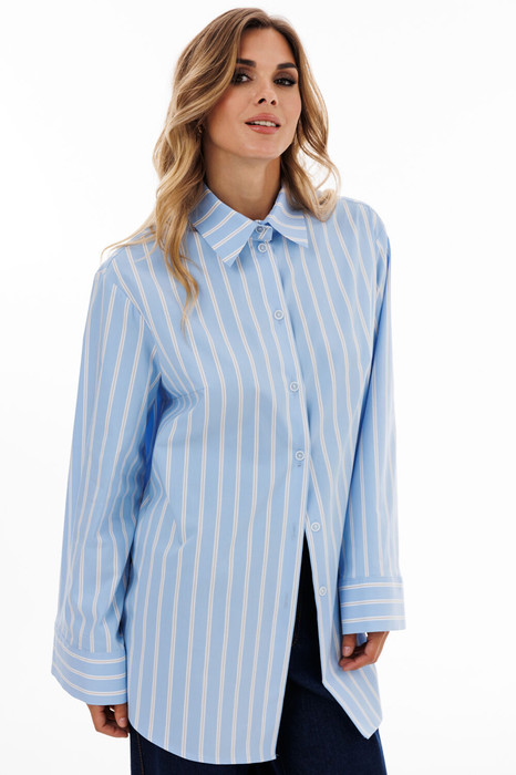 Блузка выполнена из блузочной ткани в полоску. Блузка прямого силуэта, длиной ниже линии бедер. Спереди центральная застежка на пуговицы. Спинка цельная. Вортник стояче-отложной с отрезной стойкой. Плечевой шов удлинен. Рукав рубашечный, одношовный. Низ рукава на широкой манжете. В боковых швах разрезы. Низ блузки фигурной формы.