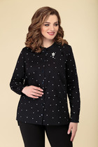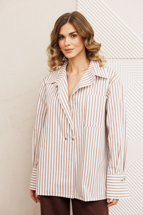 Рубашка свободного силуэта из хлопковой ткани в полоску. Перед с двубортной застежкой и карманом в районе груди. Воротник со стойкой. Спинка с кокеткой и складкой. Рукав втачной рубашечный с высокой манжетой на 2 петли и пуговицы. Длина рубашки - 70 см. Длина рукава - 60 см.