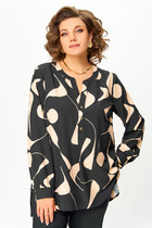 Блуза прямого свободного силуэта с рубашечным воротником на стойке и зауженным рукавом на манжете, со спущенной линией плеча. Акцентная фронтальная деталь: вертикально ассиметричная рюша. Сборка по центру рюши придает форму отделочной детали. Спереди на функциональной планке петли/пуговицы. Спинка изделия имеет горизонтальную плечевую кокетку и встречную складку для свободы облегания. По плечевому шву заложена складка. Низ блузона слегка фигурный: спинка и полочка чуть длиннее бокового шва. Длина изделия блузона по спинке 73,5 см. Рукав рубашечный одношовный,, завершается манжетой (высота 5 см) с застежкой петля/пуговица. Длина спущенного плечевого шва 33 см. Длина рукава с манжетой 41 см.