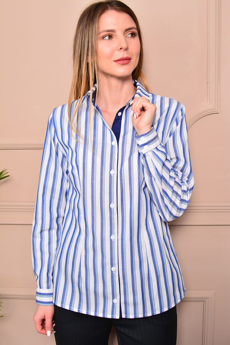Стильная блузка приталенного силуэта из ткани в полоску с декоративной планкой на пуговицах. По передним полочкам расположены нагрудные и талиевые вытачки. По спинке кокетка и талиевые вытачки. Воротник рубашечного типа с отрезной стойкой. Рукав с углубленной проймой, втачной, длиной 60 см, заканчивается манжетой с застежкой на две пуговицы. Низ рубашки закруглённый. Длина изделия по спинке 65,5 см. Фурнитура и материалы отделки могут незначительно отличаться от тех, что на фотографии.