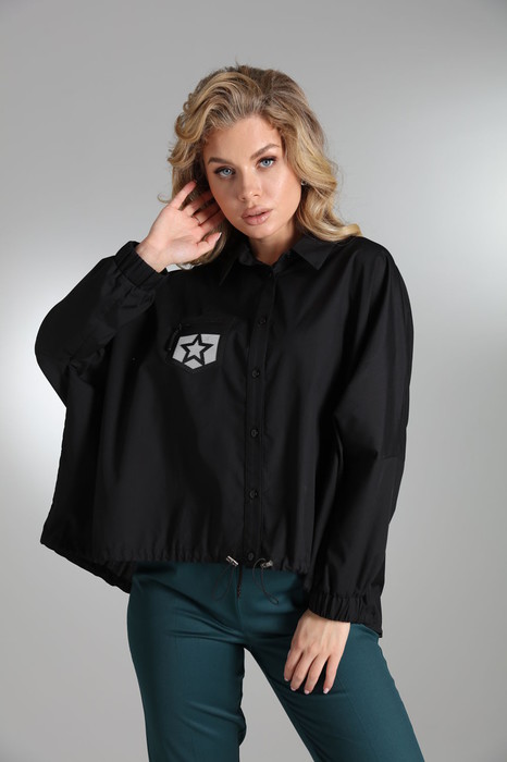 Объёмная блузка со спущенной линией плеча. Застёжка на петли и пуговицы, воротник на стойке, рубашечного типа. По переду расположен декоративный накладной карман с молнией. По низу блузы вставлена резинка с регулировками сборки . Манжеты рукавов также на резинке .