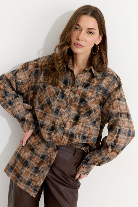 Блузка прямого силуэта из плательно-костюмной ткани с фигурным низом. Воротник стояче-отложной с отрезной стойкой, по центру застежка на петли и пуговицы. Рукав со спущенной линией плеча, по низу манжета с застежкой на петли и пуговицы. По переду накладные карманы. На спинке кокетка со складками. Обращаем ваше внимание, что фурнитура может отличаться от фото.