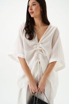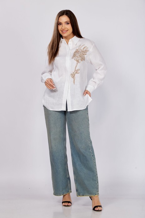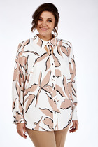 Рубашка свободного силуэта с кокеткой по спинке, из-под которой выходит встречная складка. рукав прямой рубашечный с манжетой на 2 пуговицы. Низ фигурный. Воротник рубашечный. Застежка на пуговицы