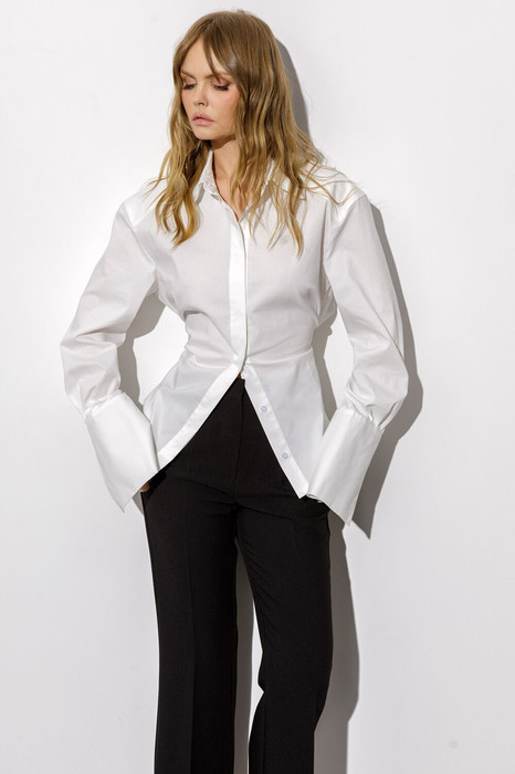Детали: приталенный силуэт, расширенная линия плеча, кокетка по переду и спинке, длинный рукав с широкой притачной манжетой, рубашечный воротник, центральная потайная застёжка на 7 пуговиц, петли в боковых швах.