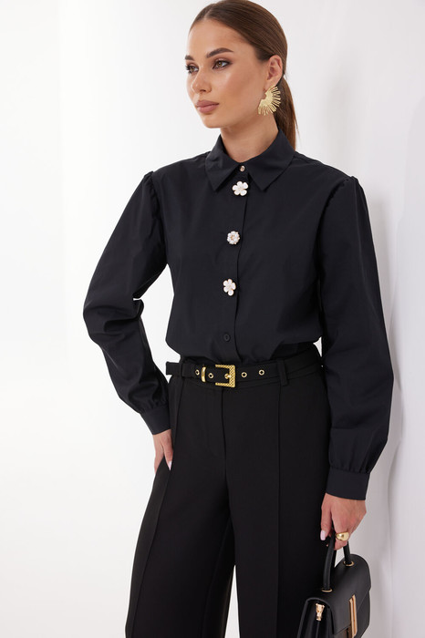 Блузка женская из рубашечной ткани, для повседневной носки, прямого силуэта с центральной застежкой на петли  пуговицы. На стойке и манжетах рукава золотистые кнопки. По окату и низу рукава легкая сборка. На верхние три пуговицы пристегиваются декоративные накладки в виде цветков.