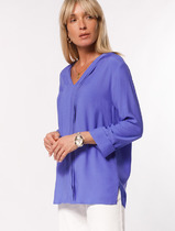 Рубашка (туника) молодежная из трикотажного полотна «флис» с эффектом «варенки», полуприлегающего силуэта, с длинными втачными рукавами на притачных манжетах, стояче-отложным воротником, нагрудным карманом, фигурным низом и центральной бортовой застежкой на петли и пуговицы. Спинка – с отрезной кокеткой и бантовой складкой в центре соединительного шва.