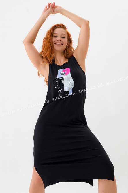 Сарафан из высококачественной кулирки с лайкрой представлен в черном цвете. Украшен броским принтом, который придает изделию особую изюминку. Модель в виде свободного и ровного силуэта мягко прилегает по талии, напоминает о ярких летних деньках.