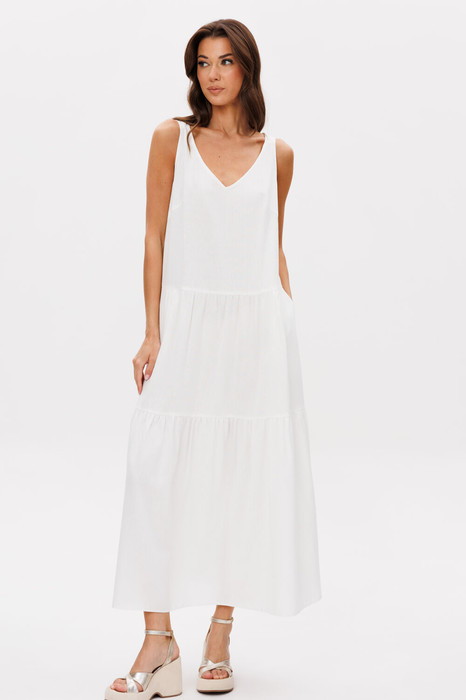 Лето-пора эффектных и максимально открытых платьев, а белый летний сарафан изо льна-символ легкости и безупречности, комбинация экологичности и модного акцента. Максимальная длина, А-силуэт, горизонтальные воланы с частичной сборкой, карманы в боковых швах, V-образный вырез на лифе. Верхняя часть полочки с нагрудной вытачкой. По верхнему срезу спинки-эластичная вставка. Модель отличает необычное расположение разноширинных шлеек, оригинально перекрывающихся на спинке.