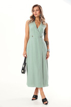 Сарафан "макси" без рукавов с застёжкой на запах на функциональные петли и пуговицы. Вырез декольте V-образный. По линии талии спинки эластичная вставлена эластичная резинка. При надобности, платье легко слегка расширить или заузить по талии, переставив пуговицы.