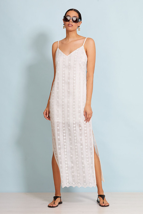 Полупрозрачное платье   из нежнейшего тонкого премиального хлопка. Длина миди. Платье прямого силуэта, свободное в талии и бедрах, Выполнено в духе минимализма. По боковым швам высокие разрезы.  Тонкие регулируемые бретели. Низ  изделия вырезан вручную. Изделие на подкладке.
