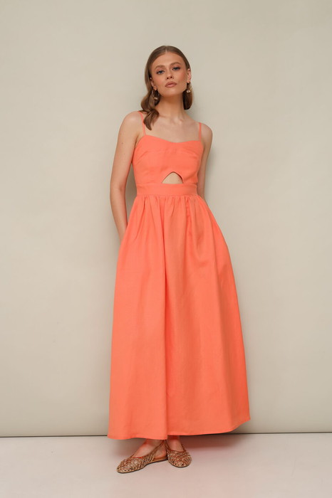 Платье отрезное по линии талии, на бретельках с регуляторами, выполнено из натурального льна. Лиф прилегающего силуэта, с фигурным вырезом в области линии талии. Застежка на потайную молнию в боковом шве. Спинка частично обработана венгеркой, для комфортной регуляции размера. Юбка А-образного силуэта, с внутренними карманами в боковых швах.