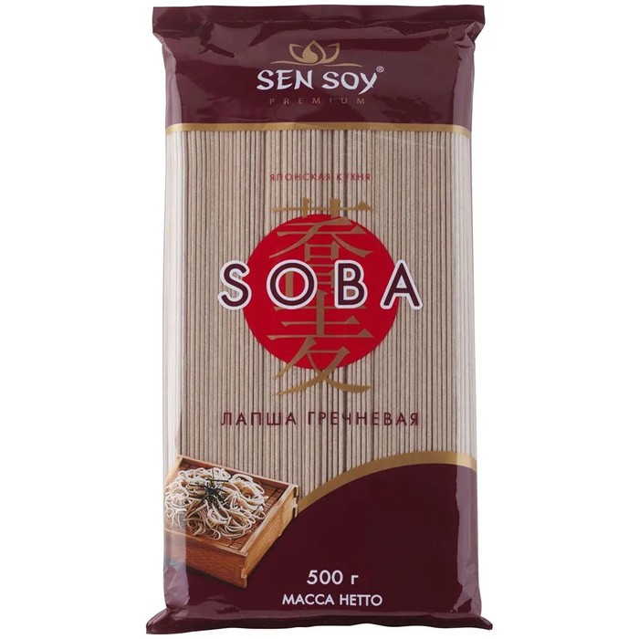 Лапша гречневая Soba Сэн Сой готовится с использованием гречневой муки, чем и объясняется ее коричневатый цвет и мягкий своеобразный оттенок вкуса.