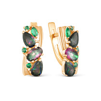 Серьги из золочёного серебра с плавленым кварцем цвета мистик, зелёными фианитам