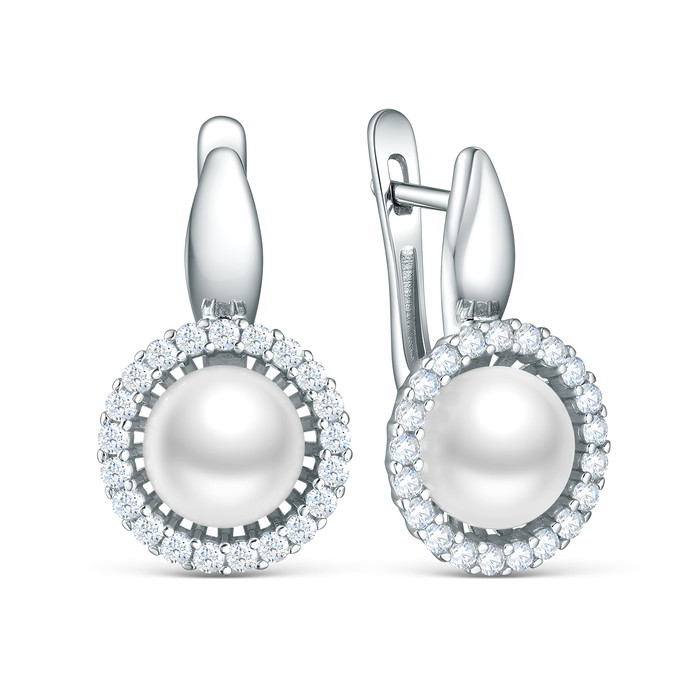 Серьги из серебра с культивированным жемчугом и фианитами родированные С50225