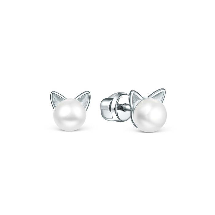 Совместные закупки Екатеринбург Ювелирные украшения и бижутерия Серьги — Серьги-пусеты из серебра с культивированным жемчугом родированные - Кошки 925 пр