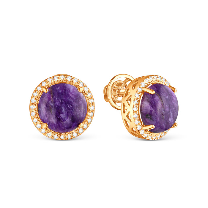 Серьги-пусеты из золочёного серебра с натуральным чароитом и фианитами 925 пробы