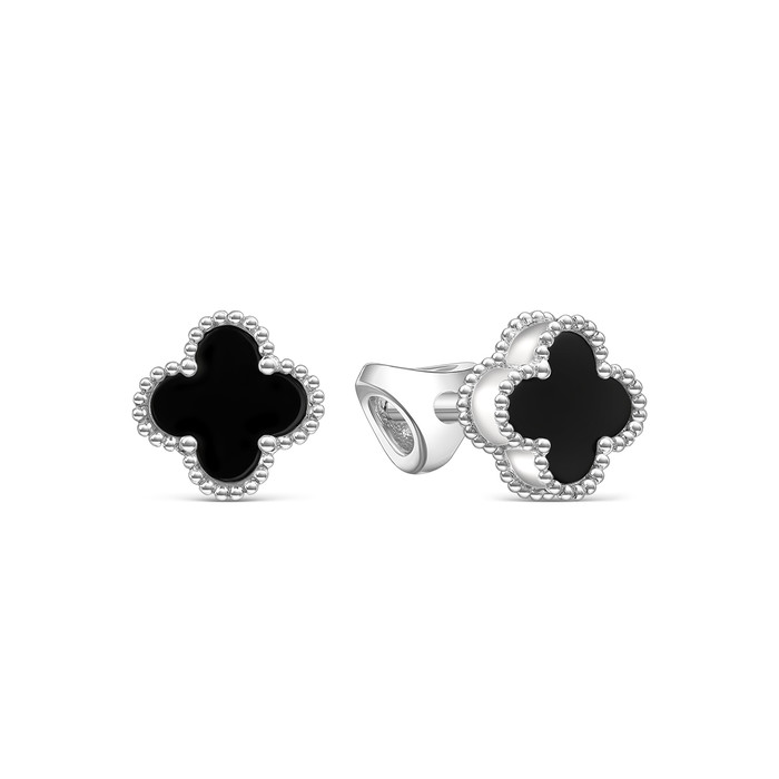 Совместные закупки Екатеринбург Ювелирные украшения и бижутерия Серьги — Серьги-пусеты Клевер Четырехлистник из серебра с чёрным агатом родированные 925