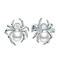 Серьги-пусеты из серебра с жемчугом Swarovski и фианитами родированные - Паучки