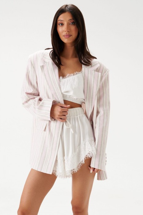 Шорты свободного кроя выполнены из струящейся ткани белого цвета. Характеристики: свободный крой, пояс на резинке с кулиской, по низу шорты украшены ажурным кружевом. Длина шорт 39 см.