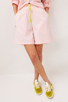 Шорты выполненны из хлопкового розового полотна в цветочки. Характеристики: широкие, короткие, пояс притачной, присборен на резинку, подкладка. В боковых швах карманы с отрезным бочком. Низ обработан в подгибку с закрытым срезом. Длина по боковому шву 35 см