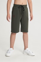 Шорты для девочек свободного силуэта из ткани. На детали переда карманы с отрезным бочком. Пояс отрезной с эластичной тесьмой внутри, на поясе пробиты петли, вставлен шнур из основного полотна. Шов стачивания пояса распошит. Шорты немного расширяются к низу. Длина выше колена.