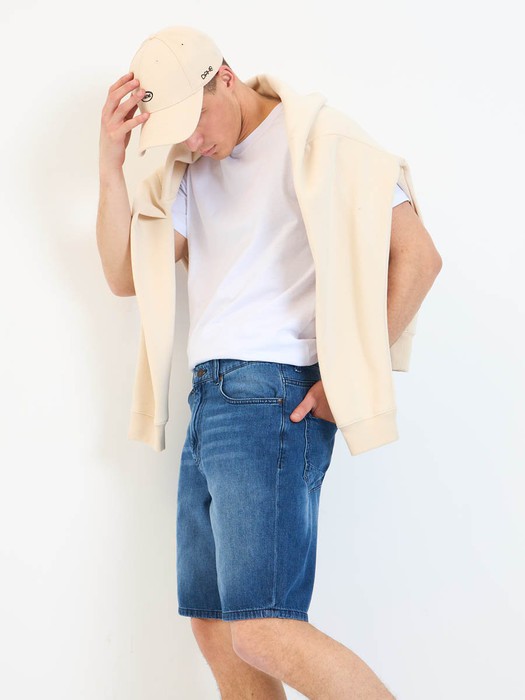 Мужские джинсовые шорты с пятью карманами. Посадка Regular fit (полуоблегающие по бедру), Высокая талия спереди и сзади.Застежка на молнии. Выполнены из облегченной хлопковой ткани denim. Средняя стирка с потёртостями и "усами" спереди и потёртостями сзади.