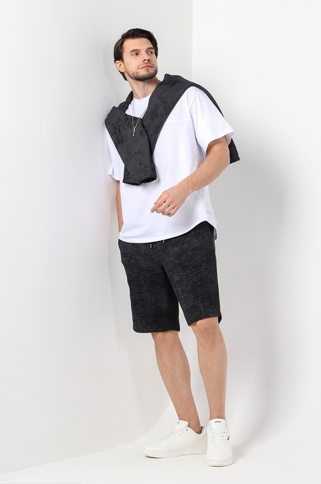 Шорты мужские из трикотажного полотна "футер-трехника -петля", на притчном поясе с эластичной тесьмой внутри, с карманами в боковых швах и имитацией застежки "гульфик". В центре пояса - две обметанные петли, чере которые продет шнурок с наконечниками для регулирования степени прилегания шорт по талии.