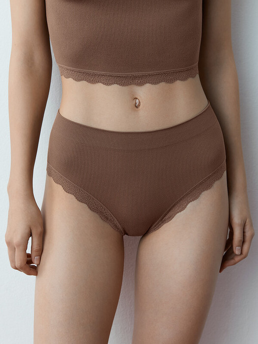 Комфортные трусы-слипы в рубчик со средней линией талии и широкой боковиной. Вырезы по линии бедра обработаны ажурным кружевом с изящным цветочным рисунком.