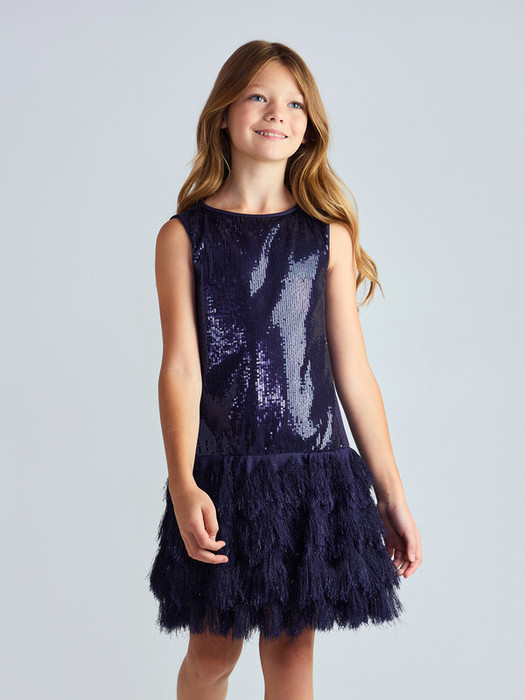 Платье в ретро стиле без рукавов с акцентом на заниженной линии талии. Лиф усыпан блёстками. Юбка изготовлена из ткани с длинным ворсом и имеет хлопковую подкладку для максимального комфорта. Застежка на скрытой молнии, расположенная на спинке. Такое платье станет верным спутником на любом торжественном мероприятии или вечернем выходе. Оно позволяет создавать образы с ноткой винтажной роскоши.