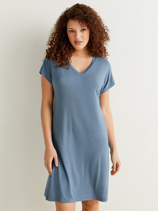 Женское домашнее платье с коротким рукавом и V-образным вырезом, длиной выше колена.