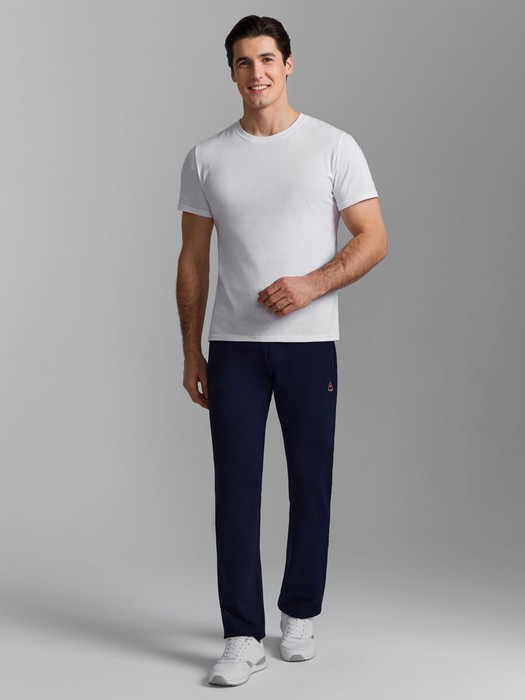 Брюки мужские из хлопкового трикотажного полотна прямого силуэта. На передних половинках карманы в рамку на молнии. Пояс по талии регулируется шнурком. Под карманом на правой половинке настрочен шеврон с фирменным