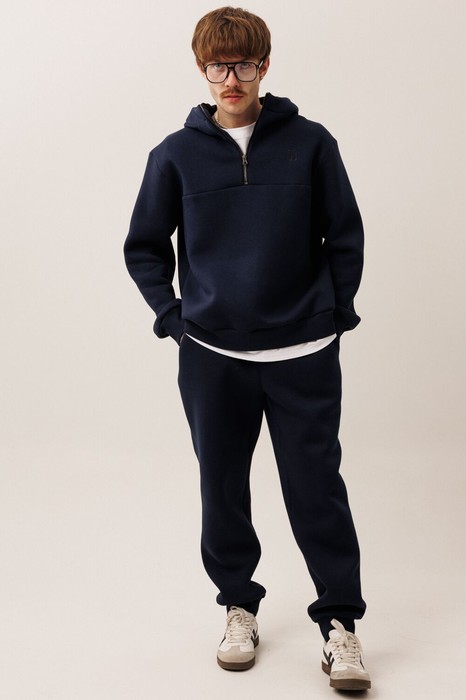Этот спортивный костюм от GOwear отлично подойдет для дома, прогулок, путешествий и отдыха. Сделан из теплой, комфортной ткани. Состоит из джемпера и брюк. Джемпер имеет двойной капюшон и короткую застежку - молнию черного контрастного цвета по центру переда. На переде с левой стороны выполнена вышивка в цвет ткани, а также расположена горизонтальная кокетка. Джемпер имеет прямой силуэт. Низ джемпера и манжеты выполнены из кашкорсе. Брюки зауженные к низу с притачным поясом (резинка и шнурок внутри). Брюки с боковыми карманами. По низу брюк – манжеты.