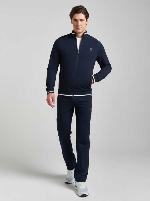 Спортивный костюм из хлопкового трикотажного полотна. Кокетки на куртке выполнены из ткани контрастного цвета. В швах притачивания кокеток проложен кант белого цвета. Карманы на куртке и брюках прорезные с листочками на молнии. Листочки выполнены из полотна контрастного цвета с белыми кантами. Посадку по фигуре обеспечивает эластичная рибана по воротнику, поясу и манжетам. Брюки прямые с накладным карманом на задней половинке. Пояс по линии талии регулируется шнурком. На брюках и полочке настрочен шеврон с фирменным логотипом.