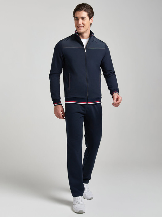 Мужской спортивный костюм из эластичного хлопкового трикотажного полотна. Куртка прямая с воротником, застегивается на молнию. Рукава втачные. Кокетки куртки и карманы отделанны плащевкой в тон основной ткани. Воротник, манжеты и пояс куртки выполнены из полосатого эластичного трикотажа. Контрастные отстрочки кокеток и планок кармана выполнены в цветовой гамме полос воротника. Брюки прямого силуэта. Прорезные карманы куртки и брюк застегиваются на молнии. Пояс брюк эластичный, по линии талии дополнительно регулируется шнуром.