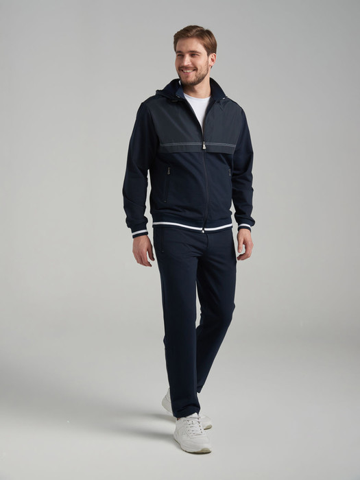Спортивный костюм из хлопкового трикотажного полотна . Куртка костюма на поясе, с воротником-стойкой, с легким капюшоном, застегивается на молнию. Рукава втачные. Несколько деталей костюма изготовлены из водонепроницаемой плащевой ткани в тон изделия - это капюшон, кокетки куртки, нижние вставки задних брючин. Все карманы комплекта прорезные,застегиваюся на молнии. Лицевая часть капюшона регулиреутся резиновым шнуром с помощью металлических фиксаторов.Пояс, воротник и манжеты куртки изготовлены из эластичного подвяза с узкой белой полосой. Брюки прямые, зауженные книзу. Пояс брюк по линии талии с эластичной резинкой так же дополнительно регулируется шнуром. На левом рукаве и под левым карманом брюк нашиты шевроны с фирменным логотипом.