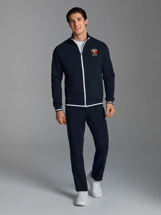 Спортивный костюм из хлопкового трикотажного полотна, в стиле ретро спорт. Карманы куртки и брюк прорезные с листочками и молниями. Посадку по фигуре обеспечивает эластичная трикотажная рибана. Брюки прямого силуэта. Пояс по линии талии регулируется шнурком. На полочке выполнена вышивка герба СССР. На спинке аппликация букв СССР. На брюках вышивка букв СССР.