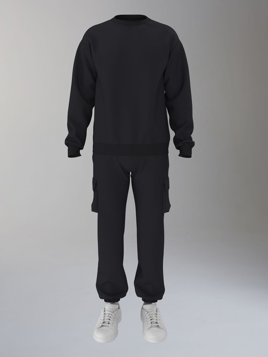 Мужской спортивный костюм , из плотного трикотажа с петельной изнанкой. Верх комплекта - свитшот ( джемпер) свободного силуэта. Рукава втачные, широкие со спущенной линией плеча. Джемпер без застежки. По вороту, низу рукавов и низу джемпера пришита рельефная вязанная резинка. На тактических брюках "Карго" два объемных накладных кармана с клапанамии и еще два кармана в боковых подрезах. Брюки зауженны книзу на резинку. Пояс брюк по линии талии с эластичной резинкой, дополнительно регулируется шнуром.