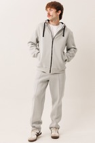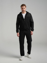 Мужской спортивный костюм из плотного трикотажа с изнаночным начесом. Верх комплекта - толстовка-худи с капюшоном, с накладным карманом "кенгуру". Рукава толстовки втачные, свободные со спущенной линией плеча, с эластичными манжетами. Брюки "Карго" с объемными накладными карманами, с клапанами, имеют два дополнительных кармана с молниями в боковых рельефах. Брюки к низу заужены на резинку. Пояс брюк эластичный, по линии талии дополнительно регулируется шнуром.