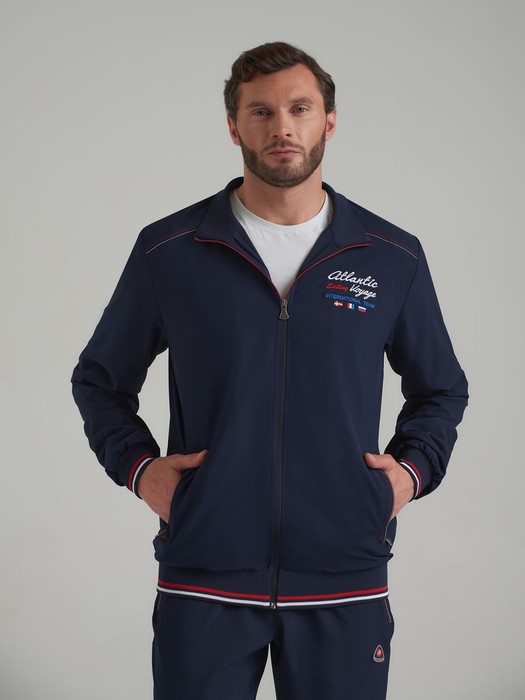 Мужской спортивный костюм изготовлен из легкой эластичной плащевой ткани. Куртка на молнии прямого силуэта на трикотажном поясе, с воротником-стойкой, на сетчатой подкладке. Рукава втачные, с трикотажными манжетами. Эластичное трикотажное полотно воротника, пояса и манжет с красной и белой полосами. Слева на груди куртки яркая вышивка в морском стиле. Карманы куртки затягиваются на молнии. Брюки прямого силуэта, без подкладки. Спереди на брюках прорезные карманы так же застегиваются на молнию. Пояс брюк выполнен с широкой эластичной резиной, дополнительно фиксируется шнуром. На левом рукаве и под левым карманом брюк - шеврон с фирменным логотипом.