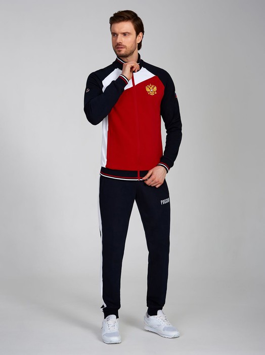 Спортивный костюм выполнен из хлопкового трикотажного полотна. Куртка с воротником на молнии. Низ куртки, рукавов и воротник из эластичного трикотажа с полосами. Спереди на куртке - контрастные вставки в цвет российского флага. карманы куртки в рельефах, застегиваются на молнию. на груди куртки слева - вышивка российского герба, на левом рукаве - шеврон российского флага. Брюки с контрастными боковыми вставками. Низ брюк с манжетами. Карманы брюк прорезные на молниях. слева под карманом - вышивка Россия. Пояс брюк дополнительно фиксируется шнуром.