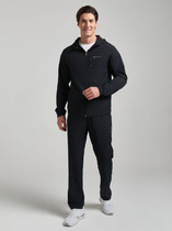 Мужской спортивный костюм изготовлен из легкой эластичной плащевой ткани. Куртка на молнии прямого силуэта на поясе, с воротником-стойкой, на сетчатой подкладке. Рукава втачные, низ рукавов заужен эластичным манжетом. Слева на груди куртки вышивка герба СССР. На спине куртки - вышивка аппликация СССР. Все вышивки выполены шелковыми нитями. Воротник куртки из эластичного трикотажного полотна с белой полосой. Кокетка переда выделена белым кантом. Низ куртки присборен поясом с эластичной резиной. Карманы куртки затягиваются на молнии. Брюки прямого силуэта, без подкладки. Спереди на брюках прорезные карманы так же застегиваются на молнию. Под левым карманом вышит логотип СССР. Пояс брюк выполнен с широкой эластичной резиной, по талии пояс дополнительно регулируется шнуром.