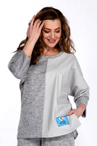 Свитшот декорирован брошью. Горловина полукруглая, обработана притачной обтачкой. Рукав со спущенной линией плеча, низ которого на манжете из основной ткани. Спинка длиннее переда и имеет форму полукруга по низу.