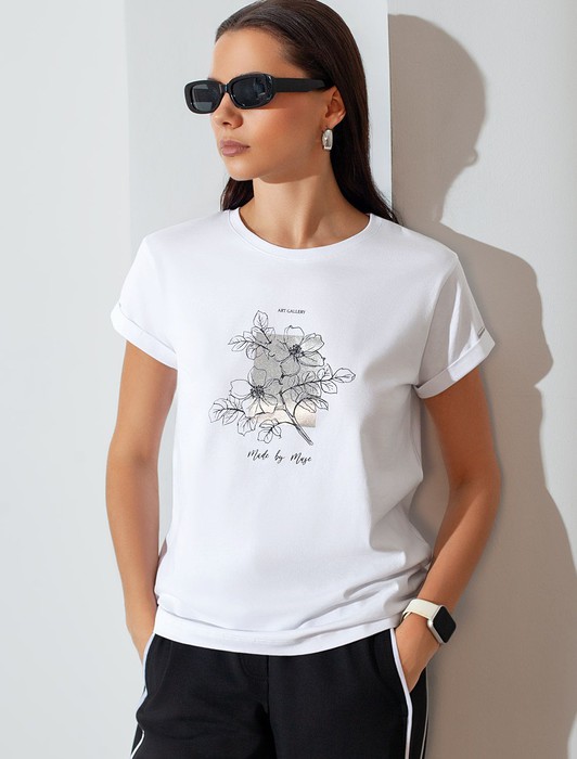 Состав: 92%Хлопок 8%ПУ Плотность: 170 Г/м2Модная футболка белого цвета привлекает внимание своим интересным дизайном и ярким принтом. Благодаря прямому крою изделие комфортно садится на любую фигуру, в том числе на большие размеры, и не сковывает движений. Круглый вырез подчеркивает современный стиль, а натуральный материал из хлопка с добавлением эластана обеспечивает удобство в повседневной носке и приятные тактильные ощущения. Прочность и износостойкая структура сохраняет первоначальную форму футболки после множества стирок. Рукава имеют аккуратные подгибы, что придает изделию завершенность и помогает сохранять аккуратный внешний вид. Принт в виде цветов и надписи нанесен красками с устойчивым покрытием, перевод надписи: Art gallery made by muse - Художественная галерея, созданная музой. Стильная футболка гармонично вписывается в любой гардероб и подойдет для прогулок, отдыха дома или неформальных встреч. Благодаря особенностям кроя модель хорошо сидит, скрывая недостатки и подчеркивая достоинства. Удобная футболка идеально сочетается с базовыми вещами, позволяя создавать новые интересные образы каждый день.