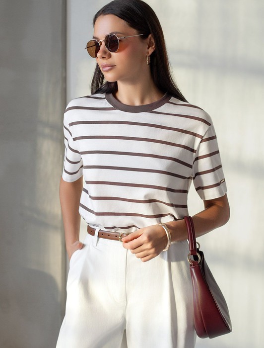 Состав: 92%Хлопок 8%ПУ Плотность: 170 Г/м2Свободная футболка белого цвета в кофейную полоску из премиального хлопка плотностью 170 Г/м2 станет универсальным решением для создания стильного и комфортного образа. Футболка прямого кроя идеально садится на любую фигуру, обеспечивая свободу движений. Дышащая ткань из натурального хлопка делает изделие легким и приятным к телу, что особенно важно в теплое время года, отлично пропускает воздух и не вызывает дискомфорта при длительном ношении. Модная футболка в полоску добавляет яркости образу, сохраняя баланс между минимализмом и выразительностью.