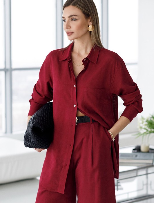 Состав: 70%Вис 30%Лен Плотность: 200 Г/м2Свободная удлиненная блузка с карманом гранатового цвета изо льна с вискозой, плотностью 200 Г/м2 - идеальный вариант для весны и лета. Сочетание льна и вискозы обеспечивает комфорт и прохладу в жаркие дни. Материал хорошо драпируется и мягко прилегает к фигуре, создавая струящиеся складки. Эта эффектная блузка сочетает в себе современный крой, удобство и стиль. Отложной воротник придает образу элегантность, спущенная линия плеча — модный и расслабленный акцент, а удлиненный крой создает красивый и легкий силуэт. Пуговицы по всей длине делают льняную рубашку особенно практичной, вы можете носить ее растегнутой, в качестве верхнего слоя. Длинная рубашка отлично подойдет на высокий рост, а так же на большие размеры, поможет скрыть возможные недостатки и сохранит при этом стильный образ. Легкая блузка подходит для повседневного гардероба, смотрится красиво, обеспечивая максимальный комфорт.